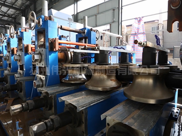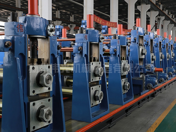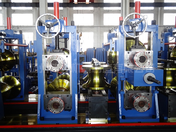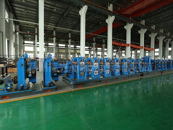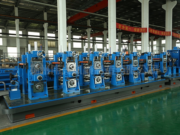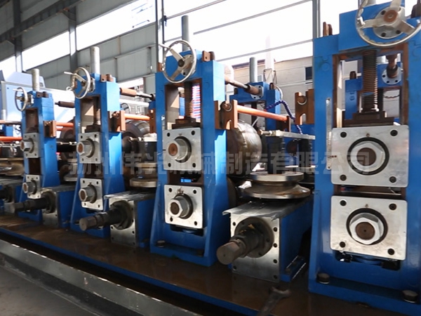 流程:上料→開卷→直頭→夾送矯平→剪切對焊→活套→成型、高頻擠壓焊接、去除外毛刺、焊縫磨光、定徑、粗矯直→飛鋸定尺→輥道→檢驗收集→打包→稱重→標記→入庫